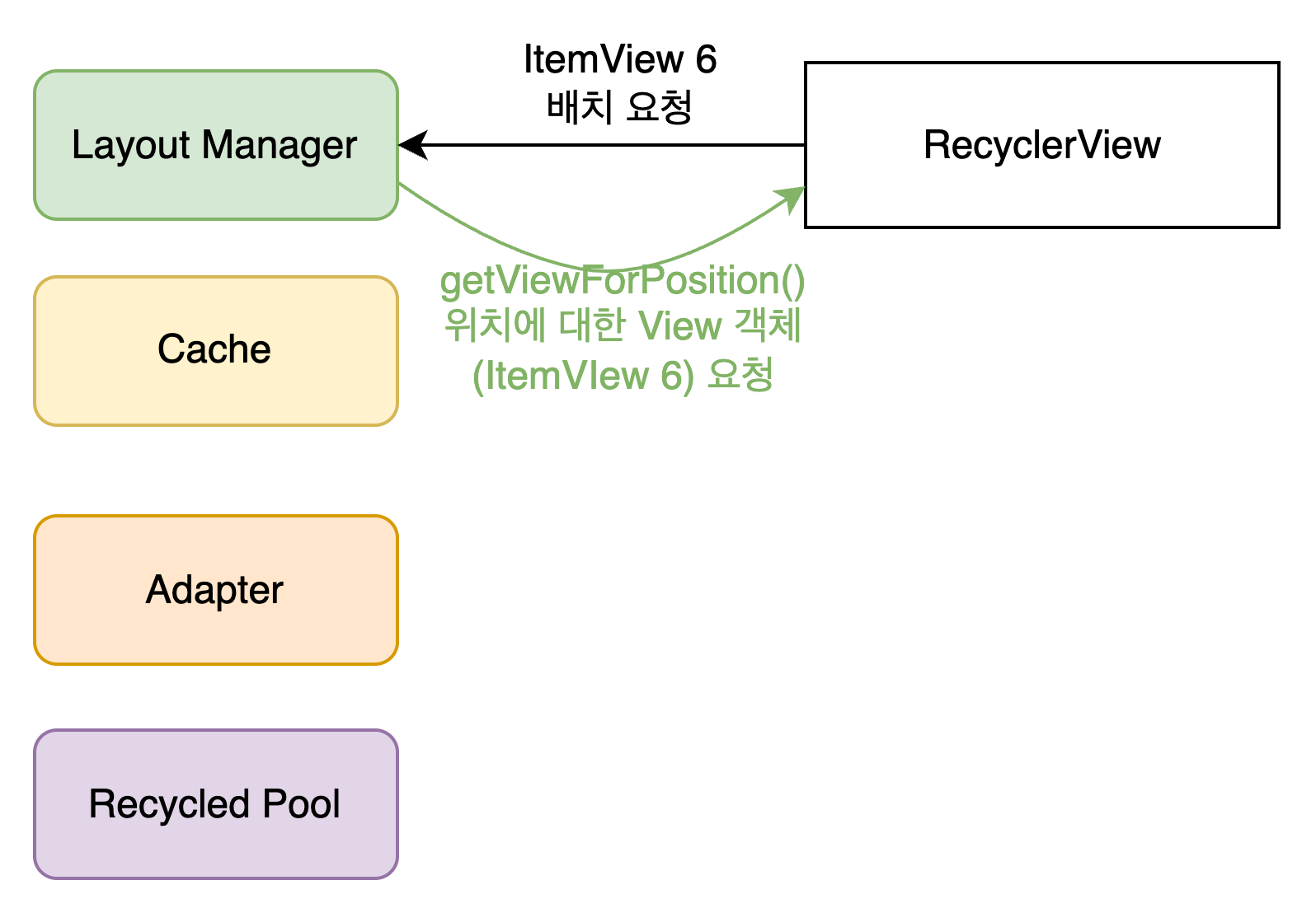 - Layout Manager는 해당 위치를 Recyclerview에게 알려 View 객체(ItemView)를 요청한다.