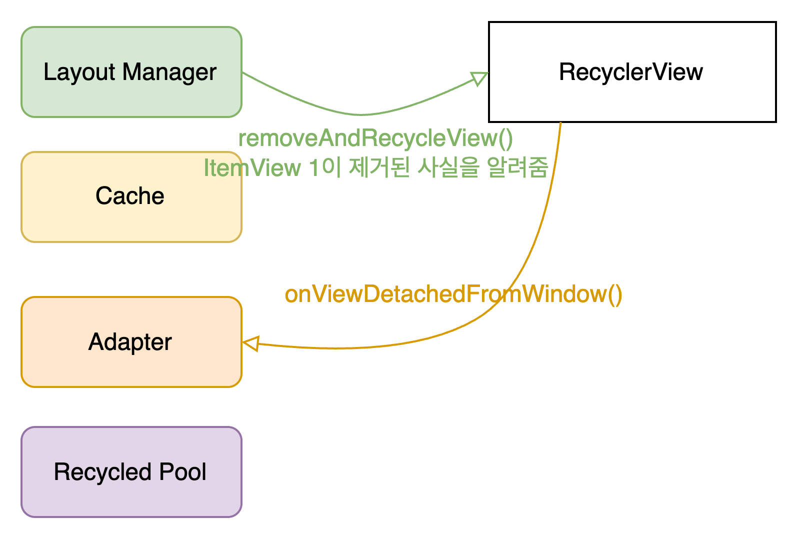 - 삭제될 ItemView에 대한 내용을 Recycled Pool에게 알려주어 해당 ItemView의 정보를 전달한다.