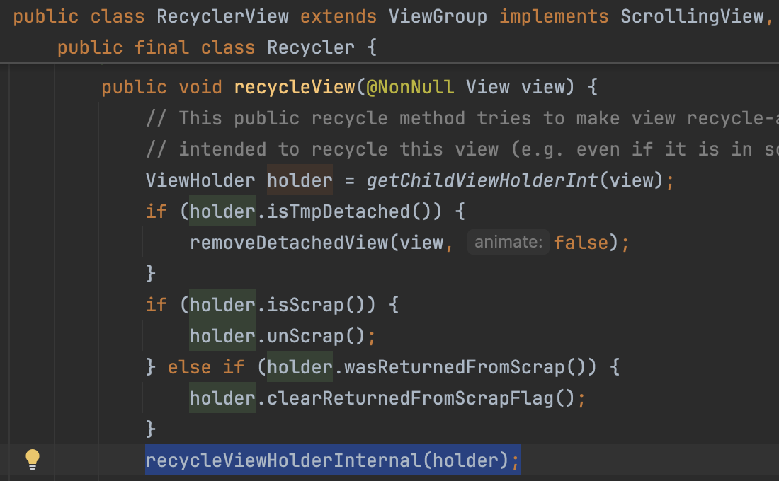 만약, Recycled Pool에 VIewHolder가 존재할 경우는 바로 해당 ViewHodler를 Bind 하는 과정으로 넘어간다.