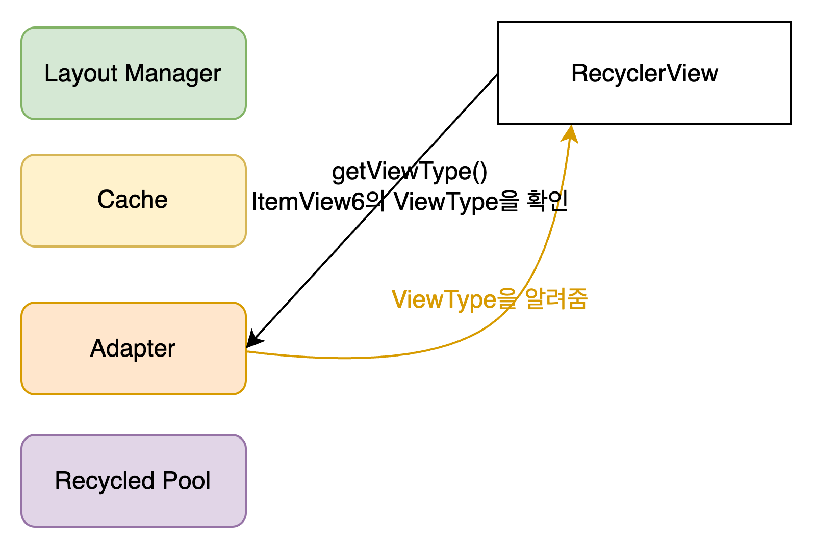 - RecyclerView는 Adapter에게 해당하는 View 객체(ItemView)의 ViewType을 요청한다.