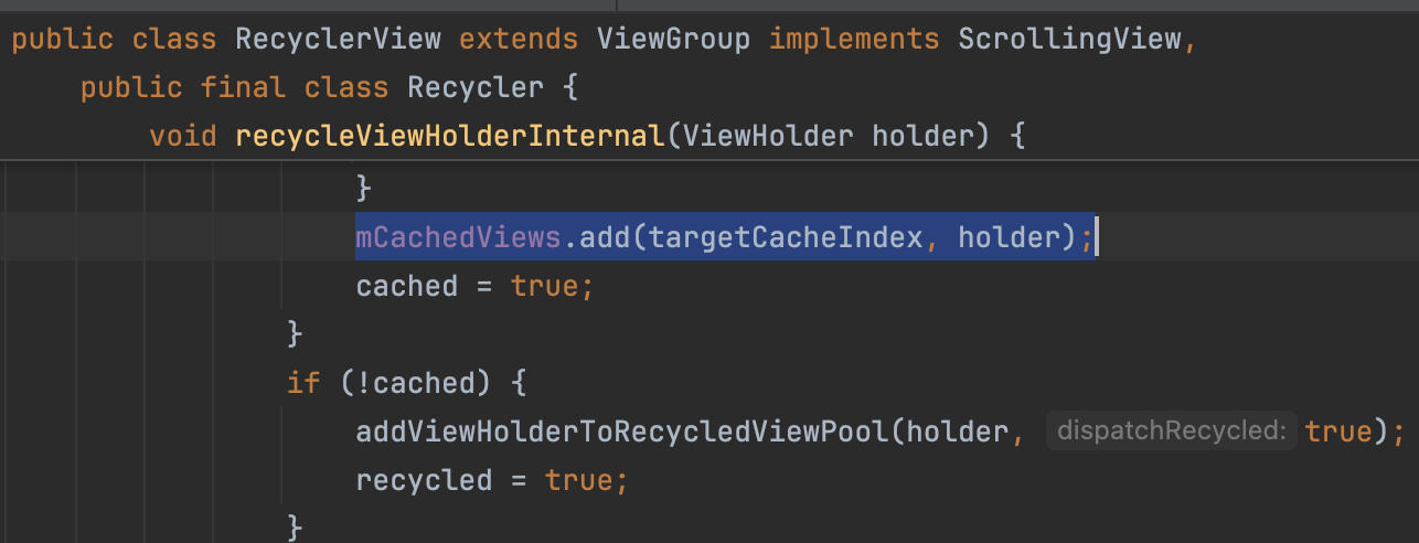 - 또한, RecyclerVeiw는 현재 제거되는 ItemView가 위치(Position)에 대해 유효한지 확인하고, Cache에 보관하라고 지시한다.