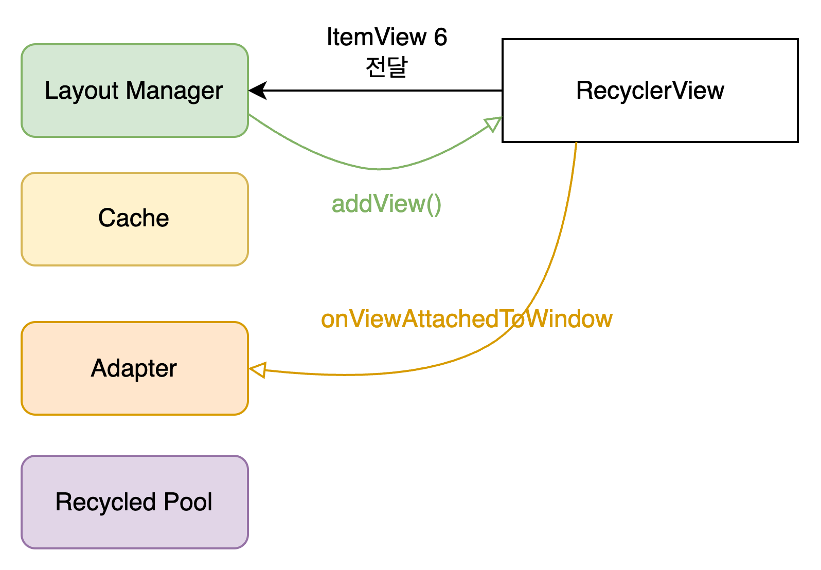 크게 보면 캐싱 적중을 한다면 Layout Manager <-> RecyclerView 상호작용만으로 View 객체를 배치할 수 있는 것이다.