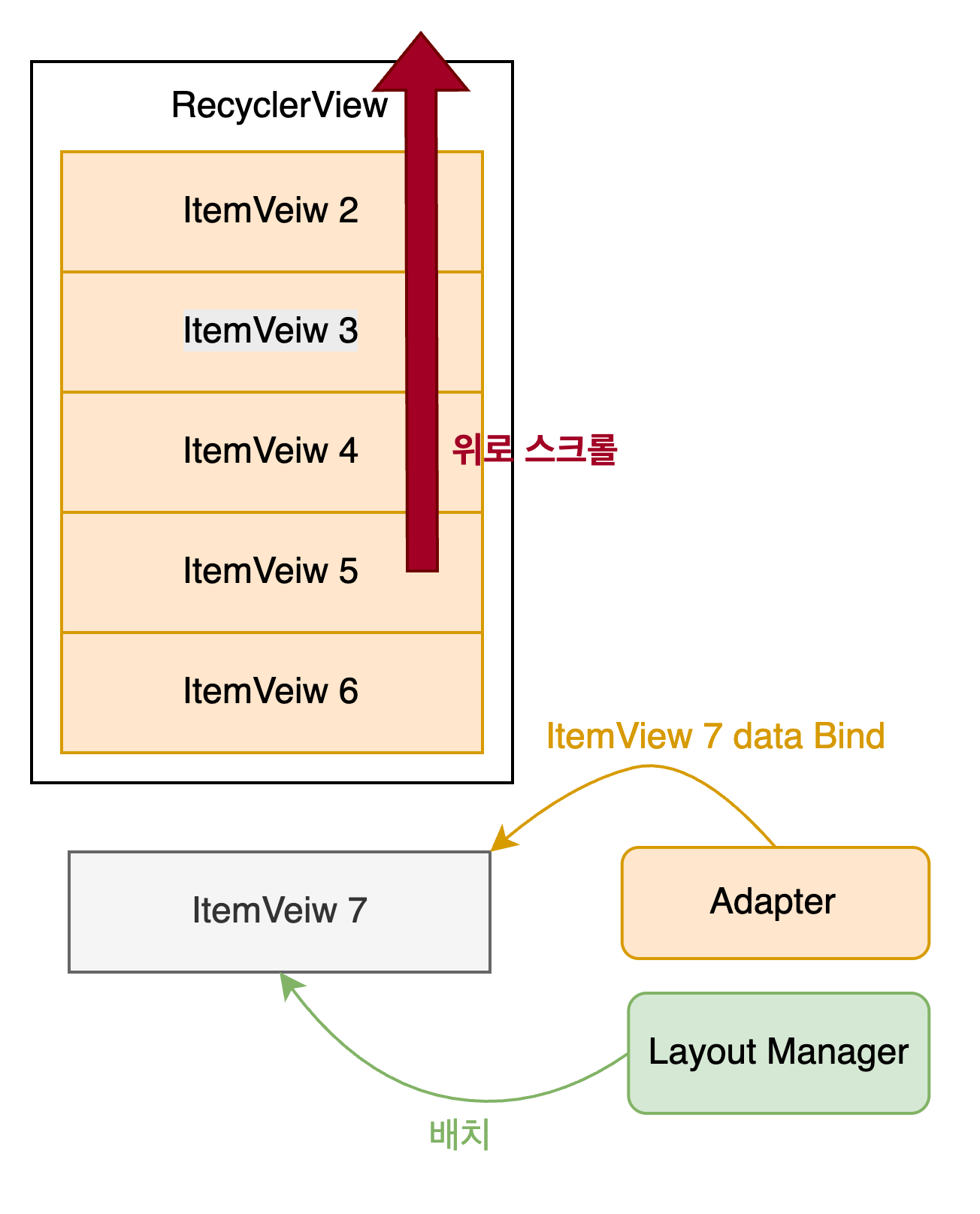 - RecyclerView에 스크롤 이벤트가 일어나고, RecyclerView는 Layout Manager에 ItemView 배치를 요청한다.